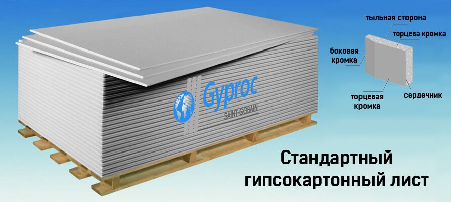 Гипсокартон размеры и виды: Листы гипсокартона всех 3 видов фирмы Gyproc, бывает длинной 2,5 и 3 метра; толщиной 6,5 мм, 9,5 мм и 12,5 мм. Именно этот гипсокартон на 2018 год является лучшим гипсокартоном на рынке и единственным, подходящим для качественного монтажа.