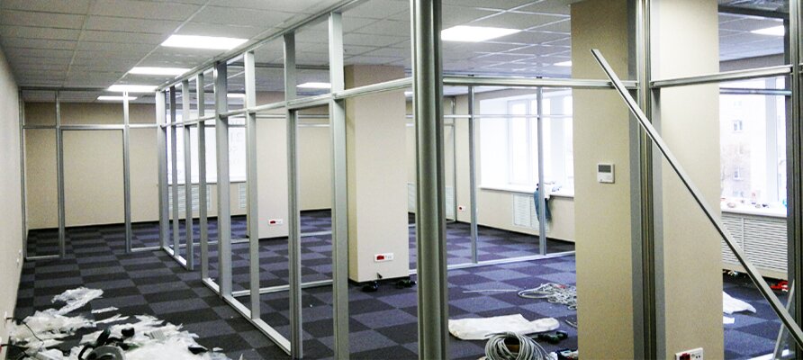 Монтаж гипсокартонных перегородок в офисе позволит разместить большое количество сотрудников в одном помещении таким образом, что бы у каждого работника был свой маленький кабинет для индивидуальной работы или работы с клиентами, в таком случае сохраняется конфиденциальность каждого клиента. Устройство офисных перегородок повышает результативность работоспособности сотрудников.